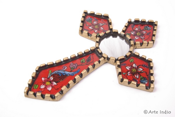 Stylistically assigned to the colonial period, they bear witness to the Spanish rule over South America, especially Peru. The frame is painted gold, the decoration with natural motifs in the technique of reverse glass painting. Therefore, each mirror is unique and differs a little from the others. The larger ones are suitable as eye-catchers on the wall, the smaller ones are very handy and individual pocket mirrors.